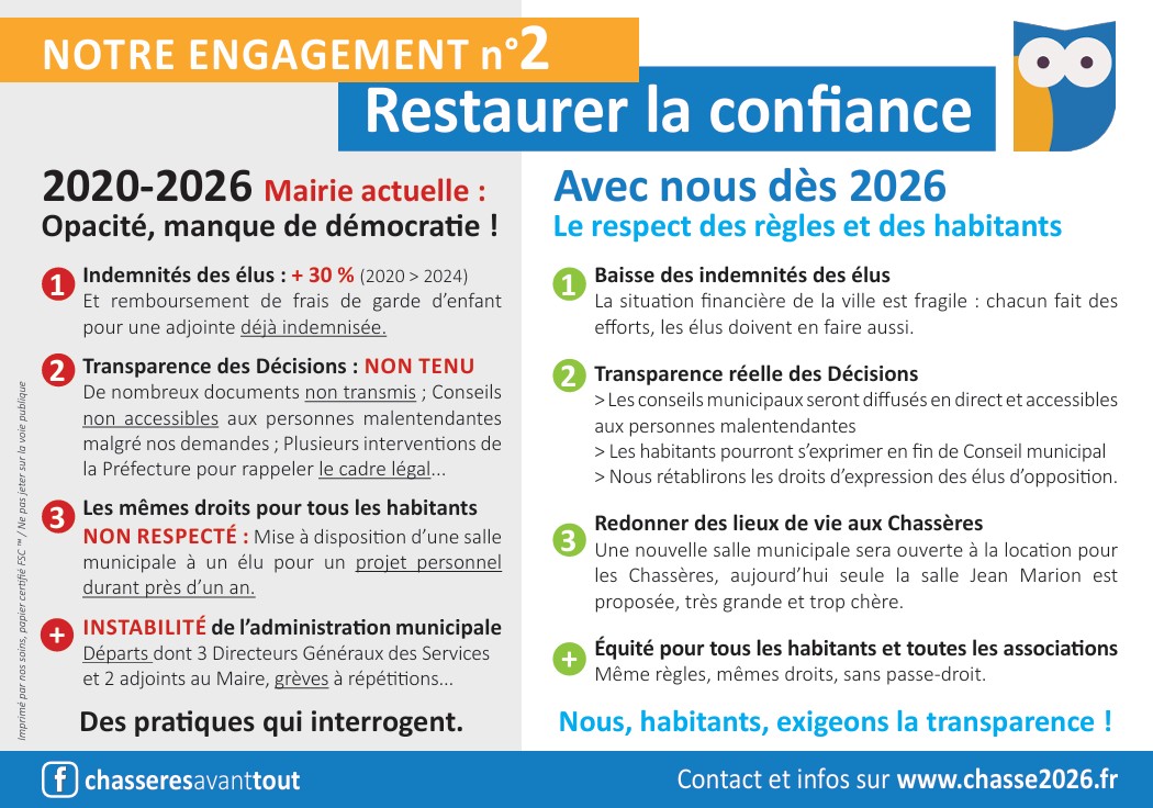 Avec nous dè 2026, faisons rimer économie et qualité de vie. Stop aux hausses d’impôts fonciers, réduisons les dépenses de fonctionnement, améliorons le pouvoir d’achat des Chassères dans la transparence budgétaire et l’ouverture démocratique